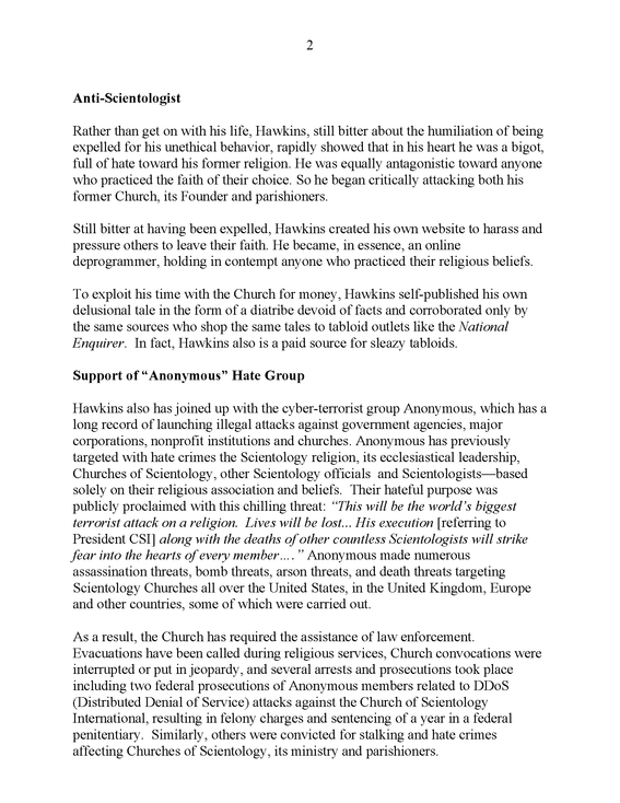 But rather than get on with his life after his dismissal from the Church, Hawkins dedicated himself to spreading hate about his former religion. Shortly after being expelled, he created an anonymous website to pressure and harass others to turn against Scientology, in essence becoming an online deprogrammer using lies in an unsuccessful effort to get others to abandon their faith.