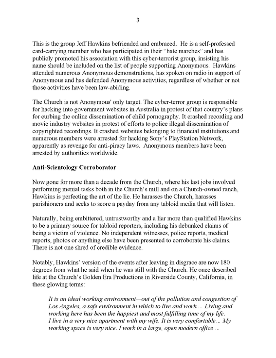 One of the sources we understand you are planning to use for your program is Jeff Hawkins, an obsessed anti-Scientologist who was expelled from the Church more than a decade ago for unsavory personal conduct as well as a long record of malfeasance as a staff member.